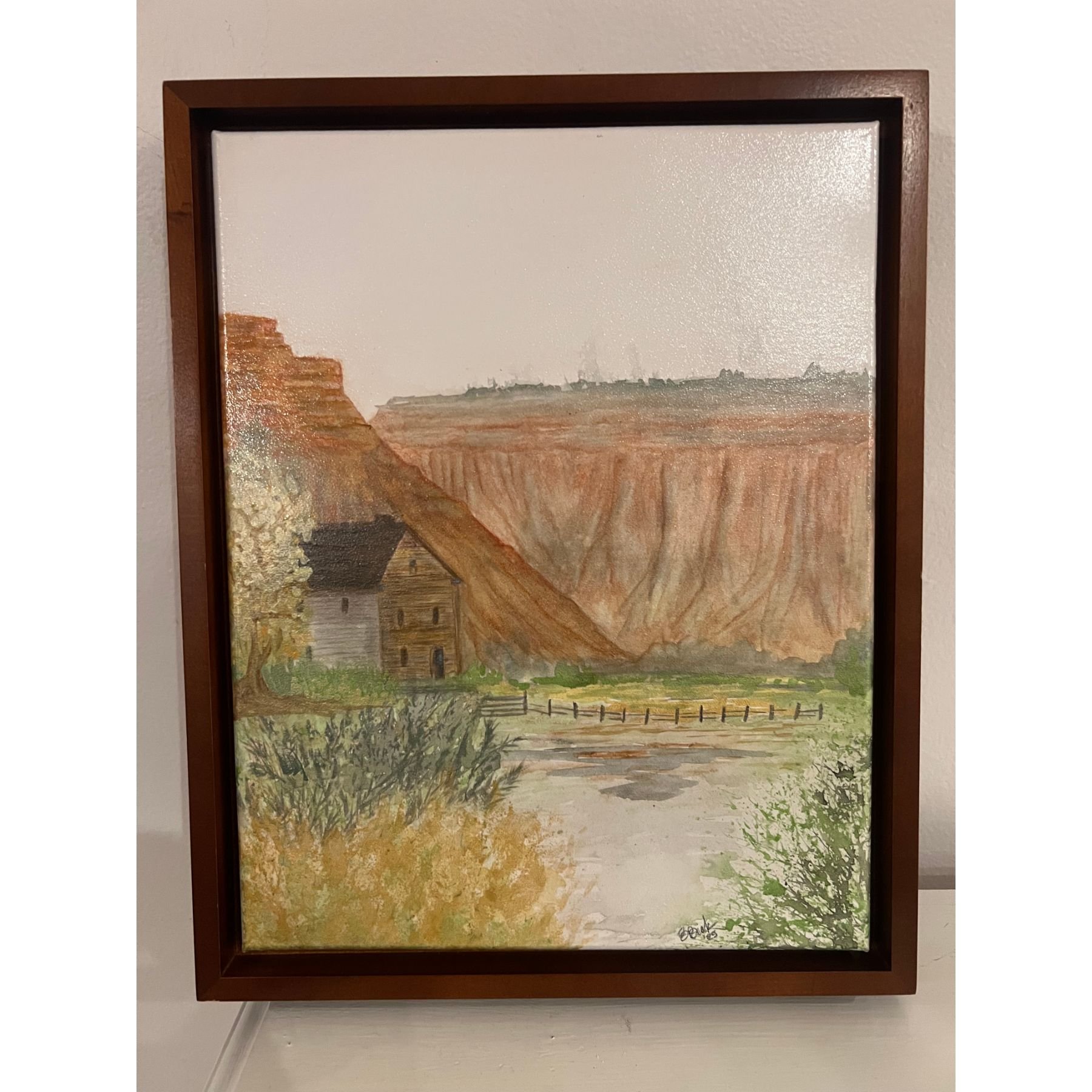 A warm watercolor scene set in Capitol Reef, featuring a rustic barn surrounded by rich fall colors. The walnut suspension frame adds a natural, modern finish that beautifully complements the earthy tones.